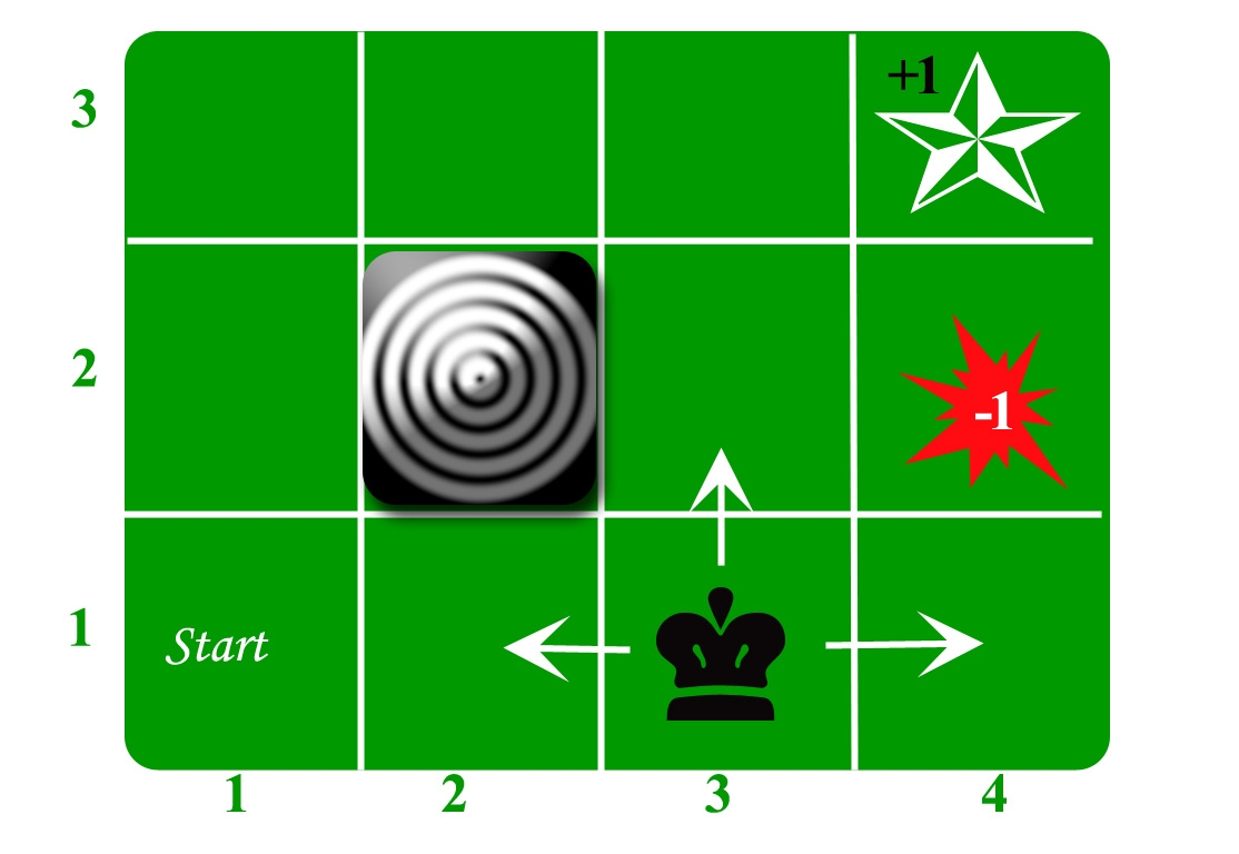 An agent lives in the grid. The above example is a 3*4 grid. The grid has a START state(grid no 1,1). The purpose of the agent is to wander around the grid to finally reach the Blue Diamond (grid no 4,3). Under all circumstances, the agent should avoid the Fire grid (orange color, grid no 4,2). Also the grid no 2,2 is a blocked grid, it acts like a wall hence the agent cannot enter it.